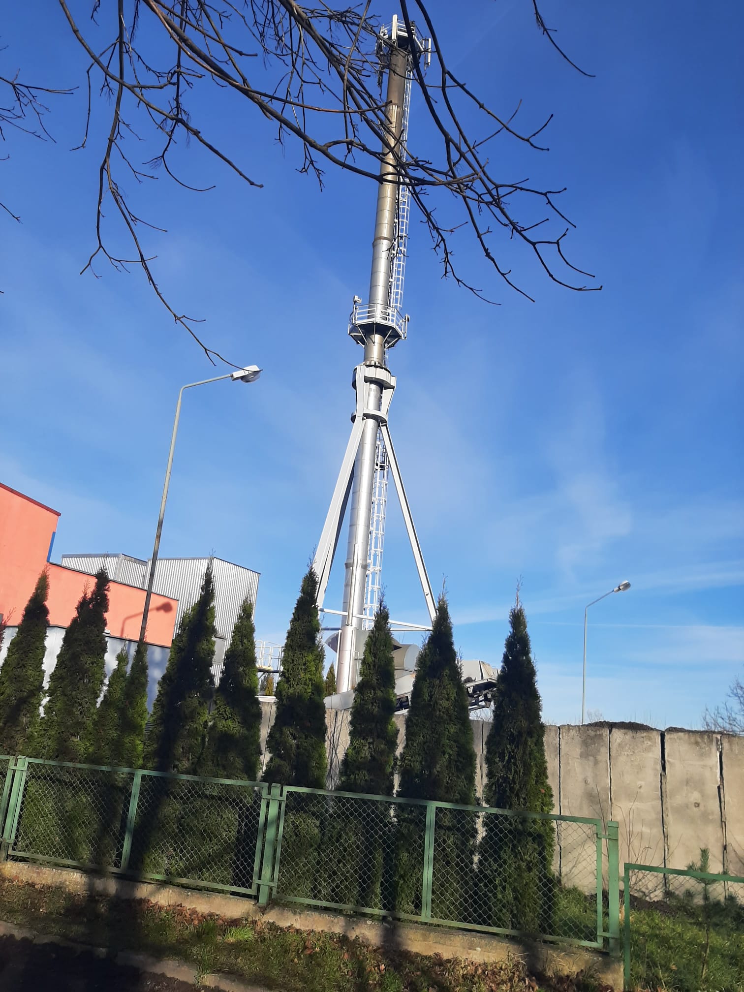 Historyczny montaż komina przemysłowego mocowanego w trójnogu wsporczym