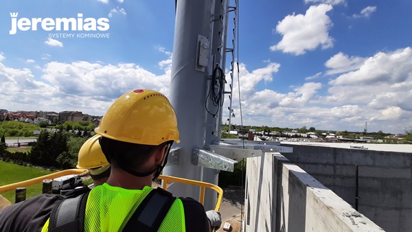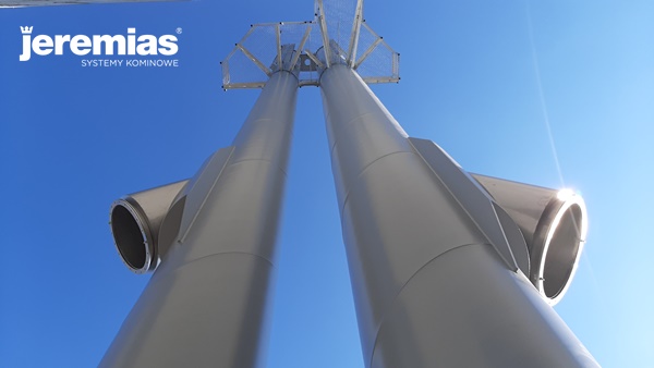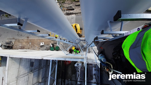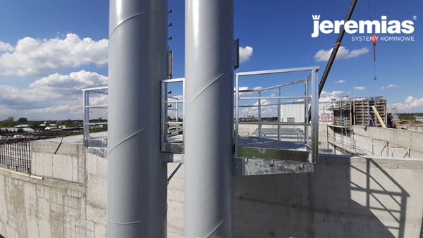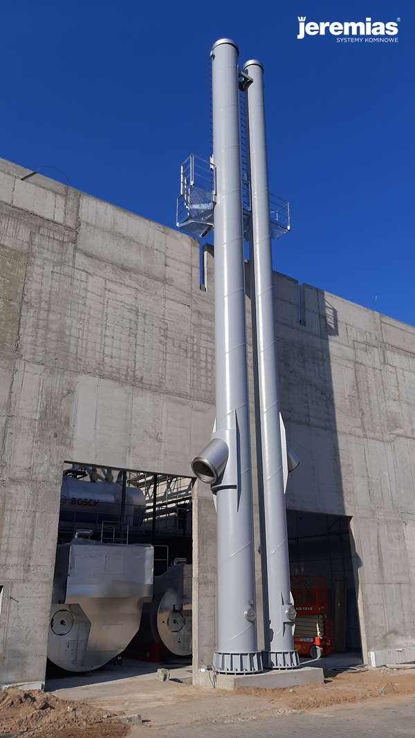 Wysokie na 20 metrów kominy wolnostojące zostały wyposażone we wspólny pomost dostępowy. Dodatkowo każdy z nich posiada 1-prętową drabinę od pomostu do szczytu każdego z kominów, która posłuży do przeprowadzenia okresowych kontroli kominiarskich. Niebawem wrócimy tu by zamontować czopuchy oraz przeprowadzić montaż trzeciego FSA.