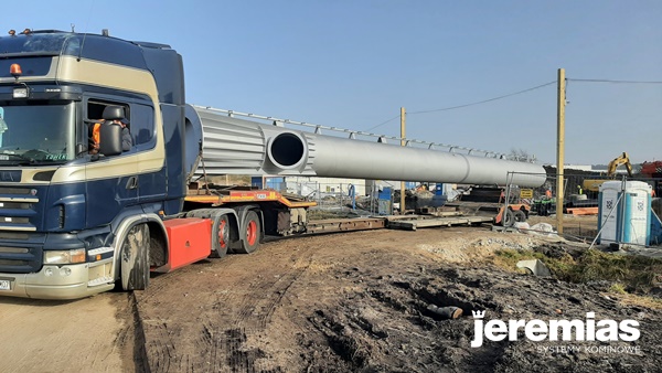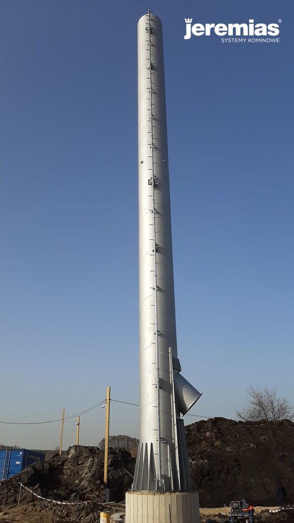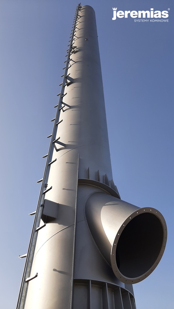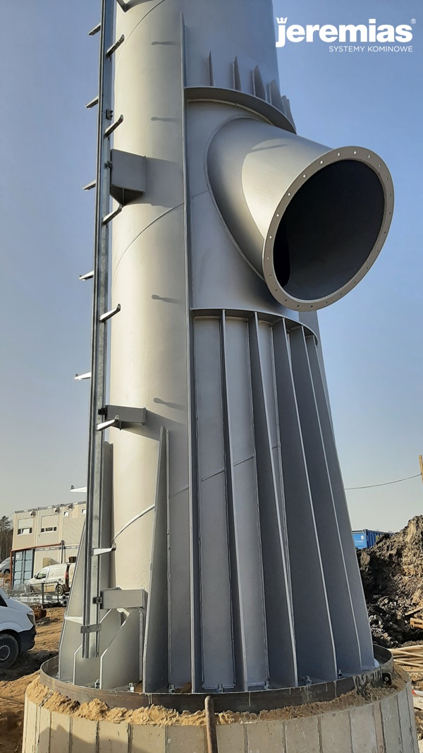 Jednościenny komin ze stali wyposażony został między innymi w odpowiednie żebra wzmacniające, przyłącze trójnikowe z kołnierzem oraz drabinę 1-prętową wraz z obalanymi spocznikami.